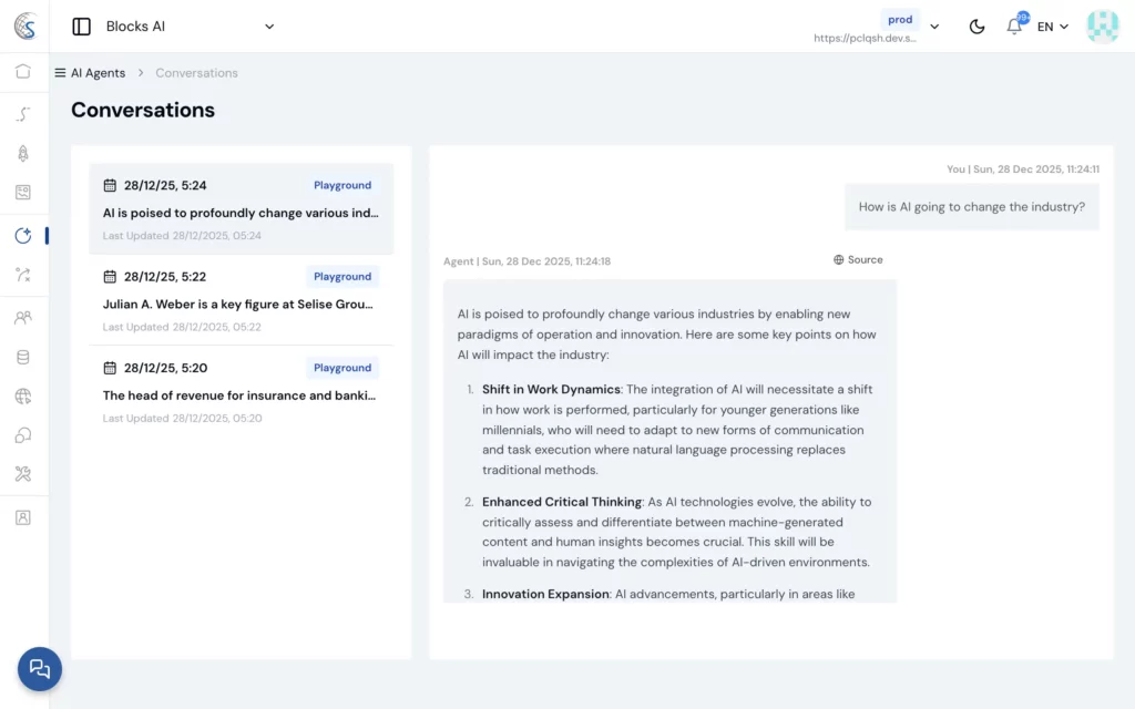 Blocks AI cites the sources of the conversations from your knowledge base and provides full traces of tool calls and responses. This ensures the agentic journey fully observable and auditable.