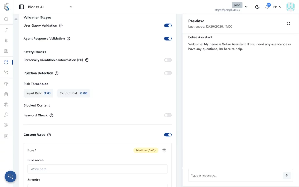 To ensure responsible and controlled agent behavior, Blocks AI includes configurable guardrails in addition to system prompts. Set limitations on user queries and agent responses. Prevent prompt injection, redact Personally Identifiable Information (PII), ban keywords & patterns, and set custom rules with risk thresholds to prevent any behavior that you consider risky.