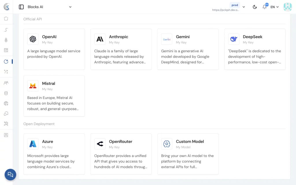 For organizations running open-weight or fine-tuned models on their own infrastructure, Blocks AI supports direct integration of custom-hosted models through its configuration interface. Simply connect your own hosted models without architectural compromise.