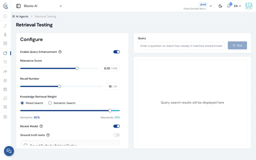 Blocks AI provides fine-grained control over retrieval behavior, including query enhancement, relevance tuning, recall depth, and the balance between keyword-based and semantic search. Retrieval testing capabilities allow teams to validate and optimize knowledge of grounding prior to production use.