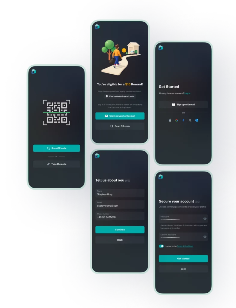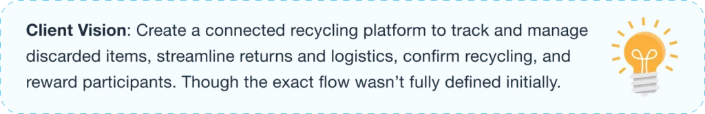 This case study focuses on the “Consumer’s role” within the recycling ecosystem. While the overall vision involves multiple stakeholders. We emphasize how “Consumers” interact with the system from onboarding to long-term participation. The study highlights key flows like easy onboarding, intuitive navigation through a central dashboard, tracking activity and earning reward points. We also examine features like claiming and sharing rewards, impact reporting, to build trust and motivation.