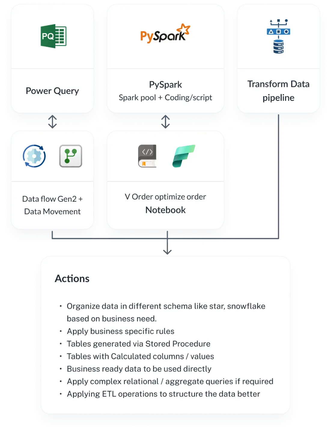 Working with the accumulated data from the bronze layer posed a different degree of challenge since many data required normalization. This step involved transforming the data into an unbiased layer of data that can be easily used to create aggregated versions of the data in the silver layer. Due to Microsoft Fabric’s top-notch support of SQL with all its capabilities we were able to write custom stored procedures and queries that let us transform the data and leverage Microsoft Scheduling Agents and ETL processes provided by Azure Data Factory. Not only were we able to use our existing SQL expertise flawlessly, but also the simple and intuitive workspaces and allowed us to orchestrate collaboration between multiple teams.